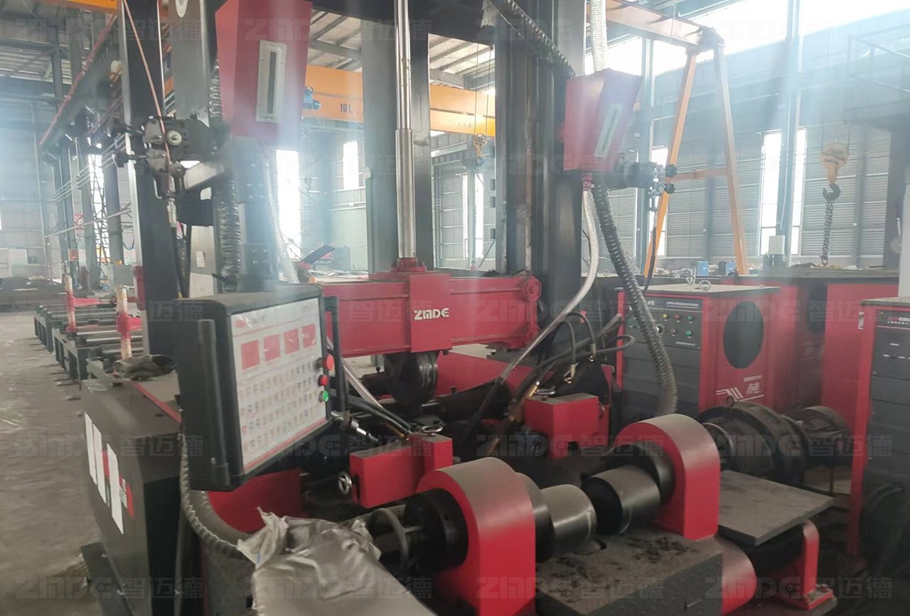 而組焊矯一體機的出現,打破了這一困境。組焊矯一體機創新性地將組立、焊接、矯正三道工序集成在一臺設備上,僅需1~2人即可操作。設備設計精密、高度集成,通過智能化控制系統,提升鋼結構加工的精準控制,并且可自動對中,無需點焊,腹板18mm以下免坡口焊接,采用熱焊熱矯工藝,從頭焊到尾,在提高生產效率的同時,有效提升了鋼構件的產品品質。與此同時,搭配智邁德“烏騅”六極六弧焊機的組焊矯一體機可實現薄板、厚板的焊接,并可選配智邁德“絕影”三極三弧焊機,實現焊接效率的大幅度提升。